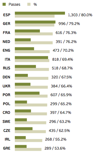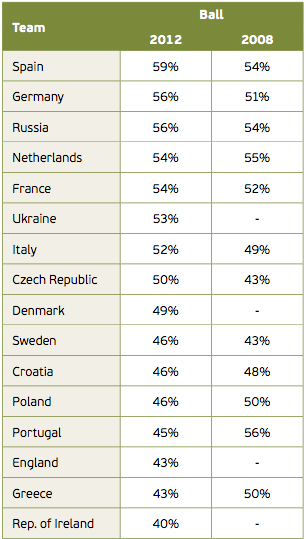 Ikke overraskende er det Spanien der "topper" denne. Men det overraskende er, at både Tjekkiet og Grækenland, der begge kysser bunden af denne opgørelse, var i kvartfinalen. Portugal, der er at finde i den nederste halvdel, røg først ud i semifinalen ved årets Europamesterskaber. Har spillet så ændret sig? Et eller andet har i hvert fald ændret sig. Til EM i 2008, opnåede Portugal den højest gennemsnitlige boldbesiddelsesprocent på 56 %. Vandt de? Nej - de blev slået ud af Tyskland i kvartfinalen, 3-2. Det står imidlertid klart, at man ikke kan konkludere noget slutteligt - men dog har tiden ændret sig og fodbolden og træneres tilgang til spillet, ændrer sig også.