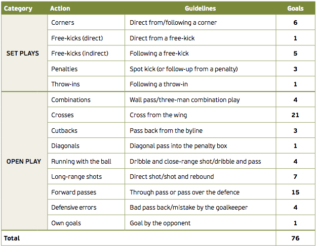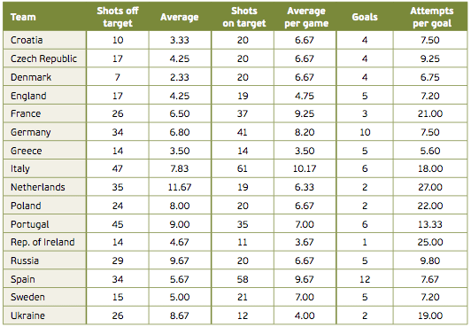 Her kan vi se, at de to hold der mødtes i sommerens EM 2012-finale, er de to hold med højest antal afslutninger pr. kamp. Ydermere kan vi også se at Danmark brugte næstfærrest afslutninger pr. scoret mål. Dette kan dog snyde... Ser vi på hvorledes målene blev scoret i sommerens EM 2012, kan vi kigge på denne statistik.