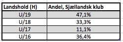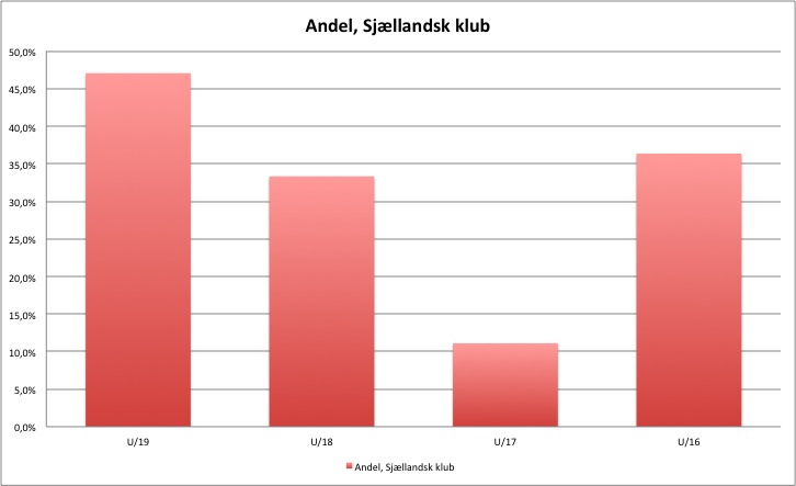 Denne viser, at man på U/16-landsholdet har 36,4 % af spillerne, som spiller i en sjællandsk klub. Altså lige godt hver tredje. På U/18-landsholdet, der spillede mod Schweiz 2 gange her i september, er det også hver tredje.