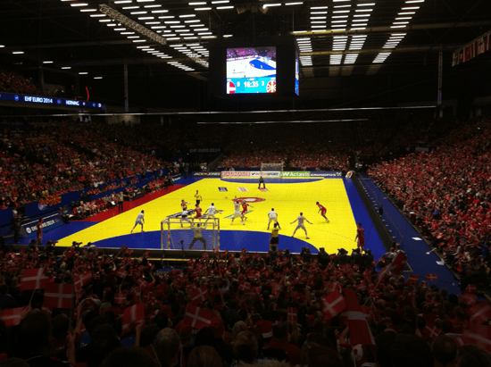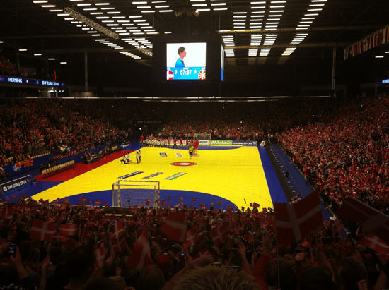 Kamppladsen er et kapitel for sig selv. Første tanke er: ”så stort er det da heller ikke”. Indtil jeg tilfældigt kommer til at tælle rækkerne mellem os og banen. Det er jo kæmpe stort! Da vi er i god tid, bruger vi et par timer på, at kikke på fanzone osv. Der er en fantastisk stemning i Herning! Det er ikke den masse psykose lignende tilstand, som prægede AG Københavns kampe. Det er fest stemning, glæde og national stolthed. Man bevæger sig mellem Makedonere, Østrigere og Tjekker. Tyskere i fuld THW Kiel og Flensburg HG fan udstyr, kommer glidende forbi en bakke Sushi og en fransk hotdog i hånden. Man ser grin og hører slagsagende på uforståelige sprog. Det er fantastisk og i et skjult øjeblik kniber man en tåre, for det er præcis sådan at håndbold og sport skal være.