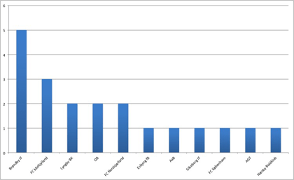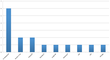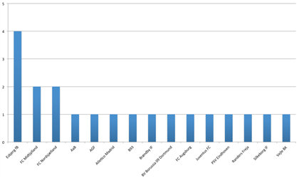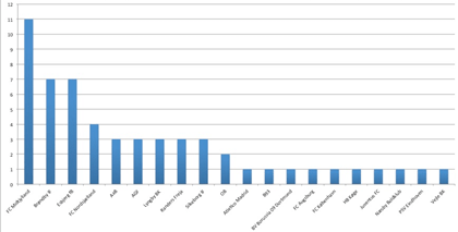 Kigger vi på, hvor alle de 56 U/landsholdsspillere, som jeg har beskrevet her, kommer fra rent klubmæssigt, er jeg faktisk selv lidt overrasket! Igennem mange år (måske for 5-10 år siden) var det ubetinget Brøndby IF, der avlede flest talenter til U/landsholdene. Sådan er det bestemt ikke længere.