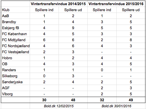 Via diverse internettjenester, kan man gå tilbage i tid og se, hvorledes en given internetadresse så ud på dét tidspunkt. Jeg brugte én af disse tjenester til at se på, hvorledes bold.dk/transfers så ud efter vintertransfervinduet 2014/2015 (torsdag den 12. Februar 2016) og hvorledes dette ser ud i dag (lørdag den 30. Januar 2016).
